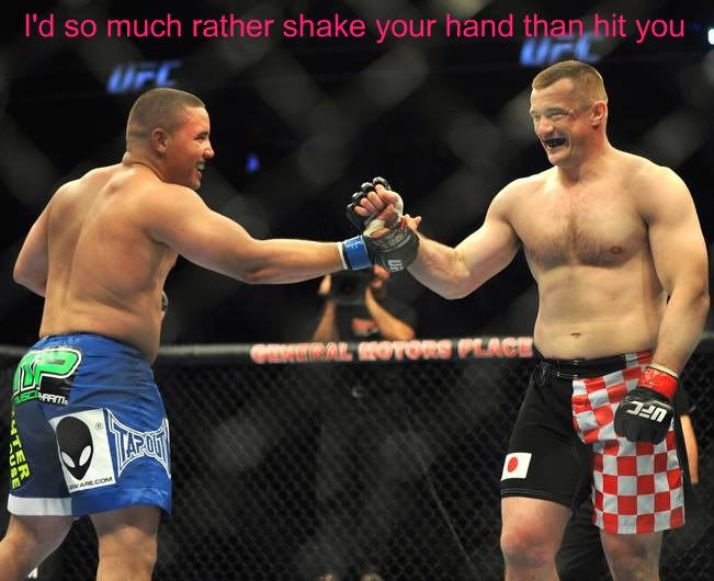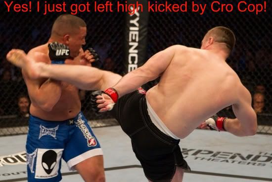 Don't get me wrong. I respect Cro Cop. I respect the sacrifice that the two men make to get in the Octagon. But how in the bloody fuck do you not go for the kill when you drop Mirko TWICE???? I won't even make the obvious referral to the fighter who knocked out a washed up fighter with a punch and a broken FREAKIN Arm. Lots of add parallells in the two ME Fights. Only, Rich didn't have too much respect for his opponent. |