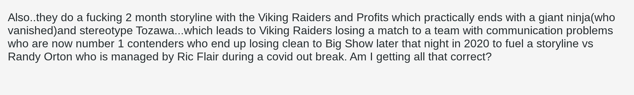 * Drew is a much better booked champion than Jon Moxley. Putting him with Asuka in the champions vs. challengers thing is logical. Dolph is far from the most compelling challenger, but at least there is the history of Dolph bringing him into the company, and Dolph gets to choose the stipulation. * Dolph calling it "Extreme Rules: Horror Show" is fucking brutal though. Can't this just be a regular PPV? What's wrong with calling this bullshit anything else? * Promos are fucking awful in WWE. The veterans who know how to talk are heads and shoulders above everyone else (Big Show, Christian, etc.). * Angel Garza & Andrade's split is being built up in a way that makes sense. Honestly, I hope they stick together for the meantime. Give them a run with the Raw Tag Team Titles. It won't hurt the belts any. But you can tell they are grooming Angel to be the babyface. * The beat the former #1 Contenders and then lost to Big Show in a Handicap Match after Garza walked out. At least it wasn't Big Show squashing them from scratch. * The Iconics don't need to wrestle ever again. They're clearly a Bruce Prichard thing. Just let them do bumpers in bikinis or something. That's their strong point. * Tozawa is getting airtime. Good for him. * The MVP/Apollo Crews stuff seems surprisingly good. MVP's "OG" gimmick is kind of cool. Lashley works way better as a mid-card bully than a legit main eventer. Apollo Crews is someone that seems to be getting more and more comfortable. Lashley vs. Crews might actually be a match that I go out of my way to watch. Not that it will be a classic or anything, but I think it will be what it is supposed to be. * Ricochet and Cedric Alexander did what they were supposed to do. They're both very white meat. There might be ways around that with Ricochet, but they're bodies for Lashley to toss around and that is fine. * Seth Rollins' gimmick is so fucking bad. * Rey Mysterio is still one of the best performers in the company. I'm not sure if this is because Rey suddenly became all-round great or if it's an indictment on the lack of personality in wrestling. Seth vs. Rey could be an in-ring classic. * This was an excellent use of Humberto Carrillo and Aleister Black. I like the two as a potential tag team. You've got MVP & Lashley, Carrillo & Black, Andrade & Garza and potentially Tozawa & Giant Ninja in there. Rollins & Murphy from time-to-time too. It's far from the best the division has ever looked, but Prichard is slowly stacking it up. It's from the world's most excellent wrestling, and there are still a lot of acts I wouldn't be able to give two flying fucks about, but on paper Garza vs. Andrade, Lashley vs. Crews, Humberto & Black as a tag team and even Tozawa are all mildly interesting things. |
