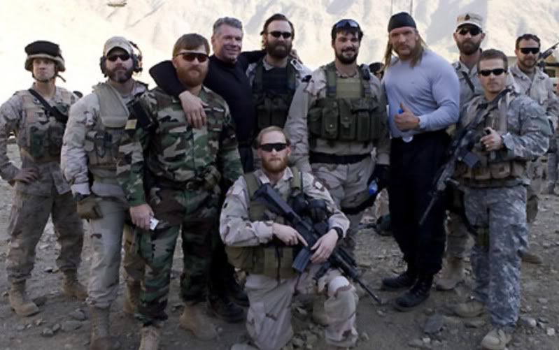 Clockwise from left: Todd Pettengill, Hercules, Arn Anderson, Vince McMahon, Crush, Dr. Death, Triple H, Jesse Ventura, Jamie Knoble, Eddie Gilbert and Stunning Steve. It's just a publicity stunt. (Someone post picture 11 of the Troops pics off WWE.com) |